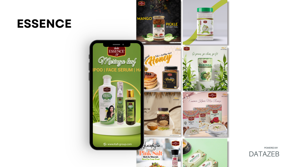 Essence, a brand under Kafi Commodities (Pvt) Limited, is dedicated to delivering highquality food products to clients worldwide. Operating internationally, Essence is recognized for its commitment to purity and quality in its offerings. Kafi Commodities has incorporated Essence as its in-house brand, establishing a strong presence in international markets. This project entailed the creation of post designs for Essence. As a company specializing in graphic design, we were tasked with producing designs for their posts, which were intended